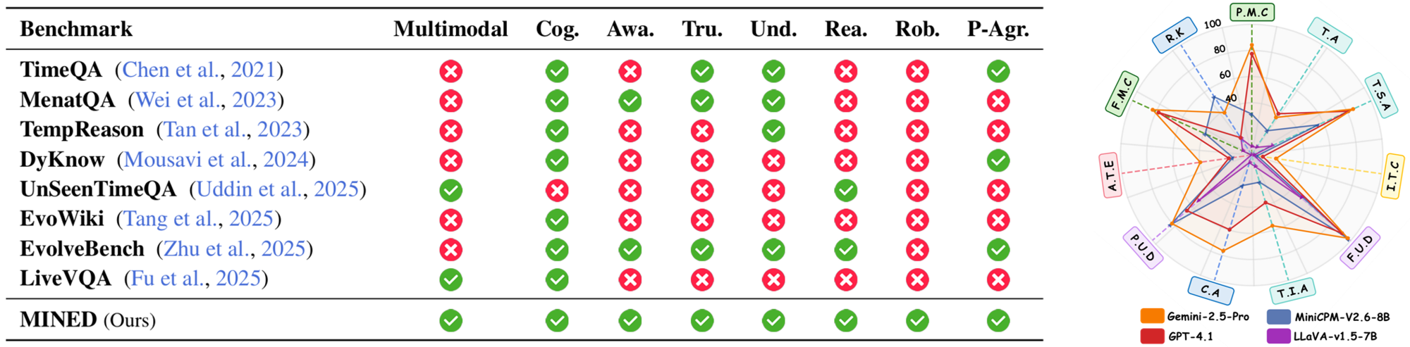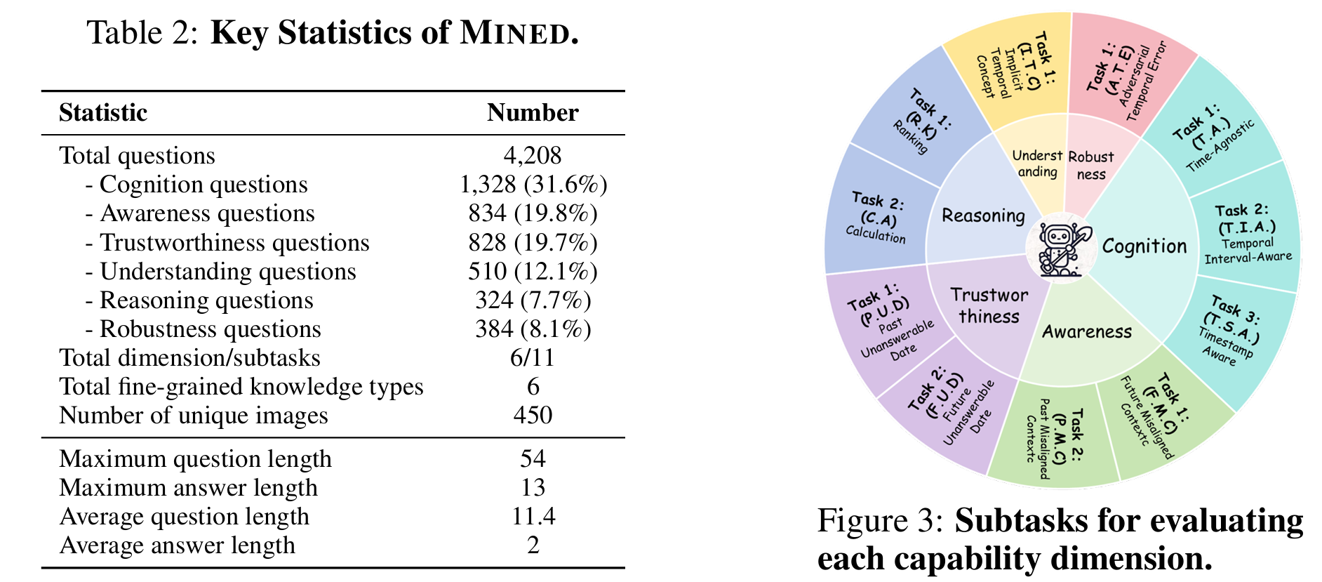 In Table 2 and Figure 3, MINED comprises 4,208 questions, spanning 6 dimensions and 6 types of fine-grained knowledge, demonstrating substantial diversity.