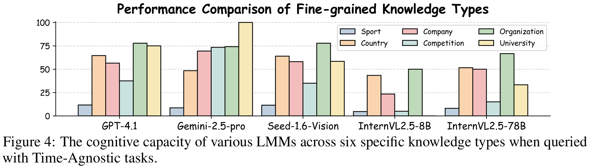 When evaluating the cognitive capacities of LMMs, we present queries conveying identical knowledge in three distinct temporal formats: Time-Agnostic, Temporal Interval-Aware, and Timestamp-Aware. For the knowledge ``Lionel Messi played for Inter Miami CF", Time-Agnostic, Temporal Interval-Aware, and Timestamp-Aware queries are formulated as follows: ``Which club does the person in the image currently play for?", ``Which club did the footballer play for between 2023 and 2024?", and ``Which club did the footballer play for on 1 January 2024?", respectively. In Table 3, all LMMs perform better on Timestamp-Aware tasks. This phenomenon may stem from the narrower temporal context required: Timestamp-Aware queries only necessitate knowledge retrieval for a specific point in time, whereas Time-Agnostic and Temporal Interval-Aware tasks demand recalling broader or time period-based information, which is more challenging. Despite this, the top-performing model, Gemini-2.5-Pro, still fails to recall approximately 25% of the knowledge, underscoring the importance of temporal sensitivity in model reasoning.