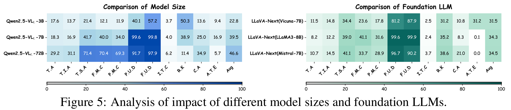 Observing Figure 5, we have the following findings: (1) Larger model sizes generally lead to improved performance on most tasks, except for R.K, P.U.D, F.U.D, and A.T.E. (2) Even with an identical architecture, LMMs exhibit divergent performance when using different foundation LLMs. For instance, while LLaVA-Next-L-8B and LLaVA-Next-M-7B perform poorly on A.T.E task, LLaVA-Next-V-7B achieves a CEM score of 31.2.