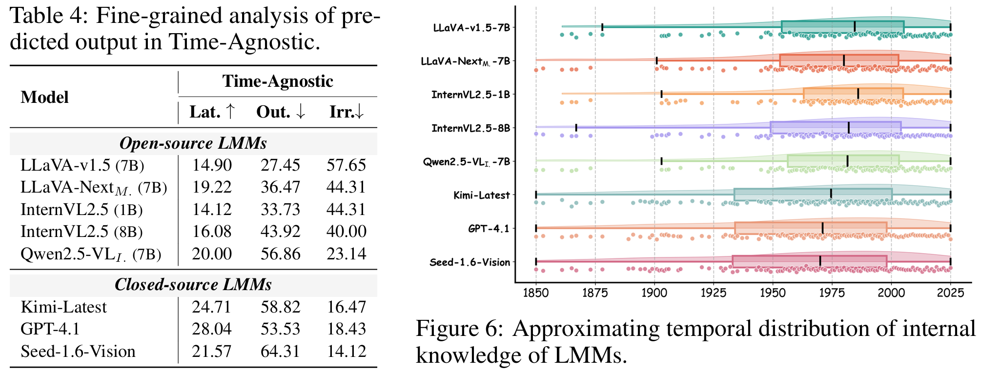 In the Time-Agnostic task, we further categorize the model's outputs into fine-grained labels. Since Prompt Agreement is adopted, each knowledge yields four outputs. If any output contains the most up-to-date value from the attribute list A, it is labeled as Latest. If none includes the latest value but at least one contains an outdated answer, it is marked as Outdated. All other cases are categorized as Irrelevant. In Table 4, open-source models not only produce a limited number of latest responses but also generate a substantial portion of irrelevant responses. In contrast, closed-source models reduce the frequency of irrelevant responses but still exhibit a high proportion of outdated responses. These statistical results indicate that a significant portion of model-generated responses are either outdated or irrelevant, highlighting a pronounced issue of inaccurate time-sensitive knowledge. Figure 6 provides an approximate visualization of the temporal distribution of knowledge within LMMs. Closed-source models demonstrate a broader temporal coverage. In contrast, the internal knowledge of open-source models is concentrated in more recent time periods, indicating a comparative difficulty in recalling information from distant historical contexts.