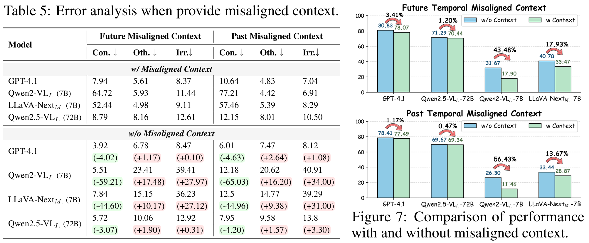 Compared to T.S.A. results in Table 3, LMMs' performance degrades when queries are accompanied by temporal misaligned context, which impedes correct knowledge recall. For the experiment in Figure 7, we use the same timestamp in the queries, with the only difference being whether the input query included the relevant but temporal misaligned text. We Observationerve that more capable closed-source models and larger open-source models exhibit greater robustness to temporally misaligned context, whereas smaller open-source models suffer significant performance degradation. For instance, Qwen2-VL-I-7B shows declines of 43.84% on F.M.C and 56.43% on P.M.C. These results indicate that smaller models are more susceptible to misleading temporal context, with past misaligned information having a particularly strong negative impact.