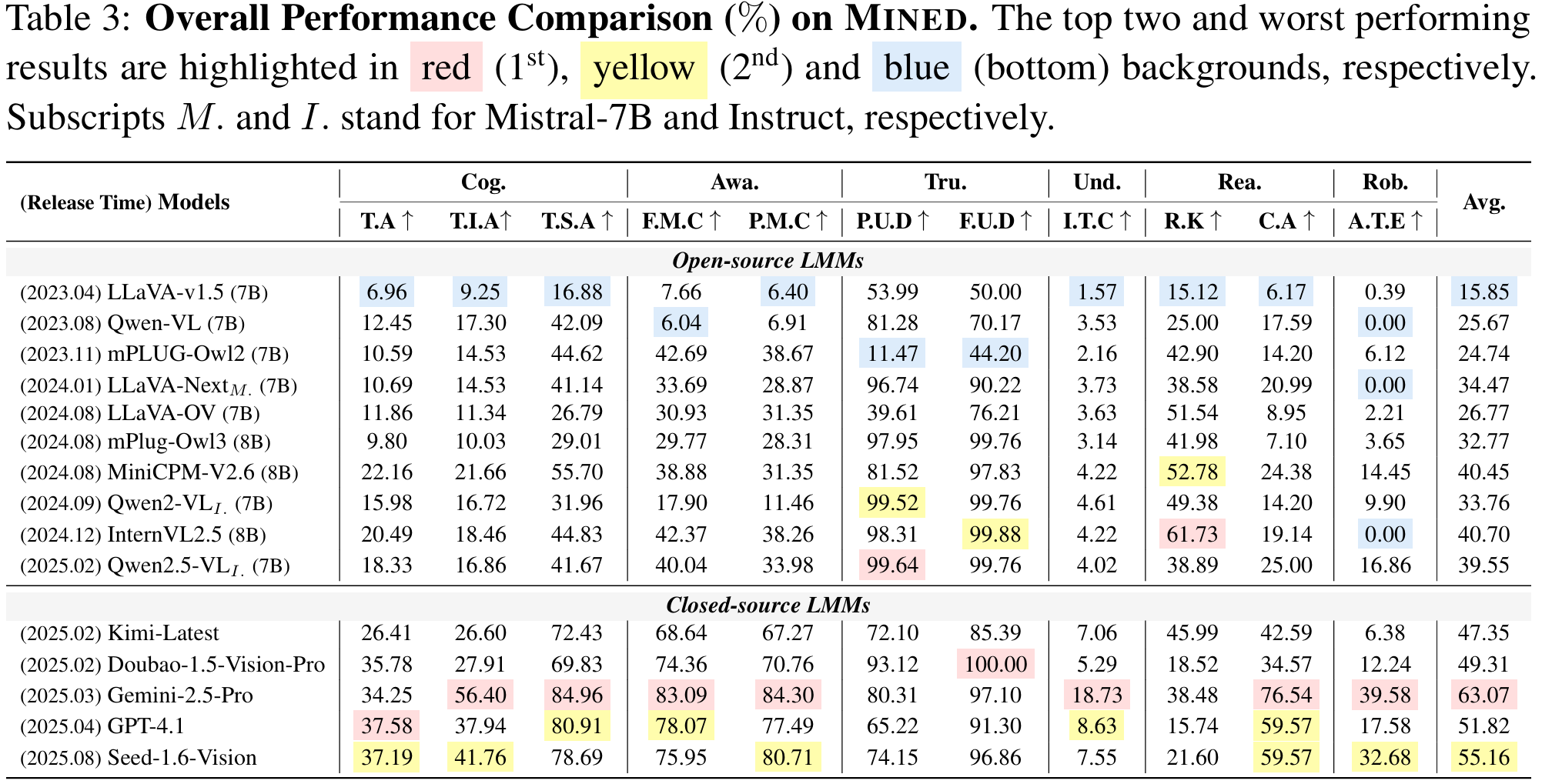 Avg. results in Table 3 reveal an approximate trend: more recent LMMs generally achieve superior overall performance, indicating a link between temporal awareness and recency of development.