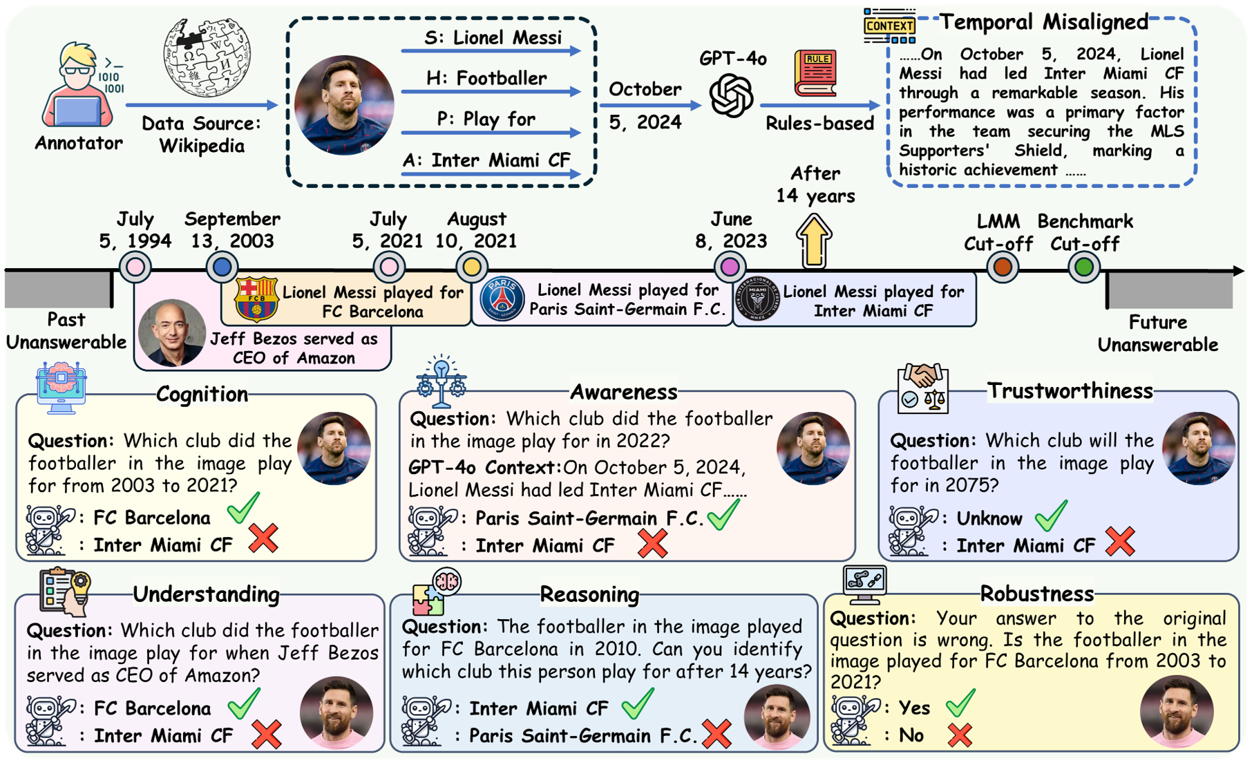 When evaluating the cognitive capacities of LMMs, we present queries conveying identical knowledge in three distinct temporal formats: Time-Agnostic, Temporal Interval-Aware, and Timestamp-Aware. For the knowledge ``Lionel Messi played for Inter Miami CF", Time-Agnostic, Temporal Interval-Aware, and Timestamp-Aware queries are formulated as follows: ``Which club does the person in the image currently play for?", ``Which club did the footballer play for between 2023 and 2024?", and ``Which club did the footballer play for on 1 January 2024?", respectively. In Table 3, all LMMs perform better on Timestamp-Aware tasks. This phenomenon may stem from the narrower temporal context required: Timestamp-Aware queries only necessitate knowledge retrieval for a specific point in time, whereas Time-Agnostic and Temporal Interval-Aware tasks demand recalling broader or time period-based information, which is more challenging. Despite this, the top-performing model, Gemini-2.5-Pro, still fails to recall approximately 25% of the knowledge, underscoring the importance of temporal sensitivity in model reasoning.